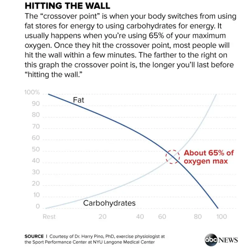 hitting the wall“撞墙”一般发生在特出2小时的耐力赛当中,此时的参赛者应该跑了28~32公里了,身段内的糖原用光了,莫得了燃料,身段立时就失去了能源,疲劳感顷刻间袭来,尽管此时大脑还在携带着参赛者前进,但身段是不论若何王人“燃尽”了。