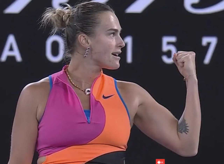告捷的萨巴伦卡抓紧拳头摆出一个秀肌肉的霸气动作,对着斯维托丽娜离开的方针……