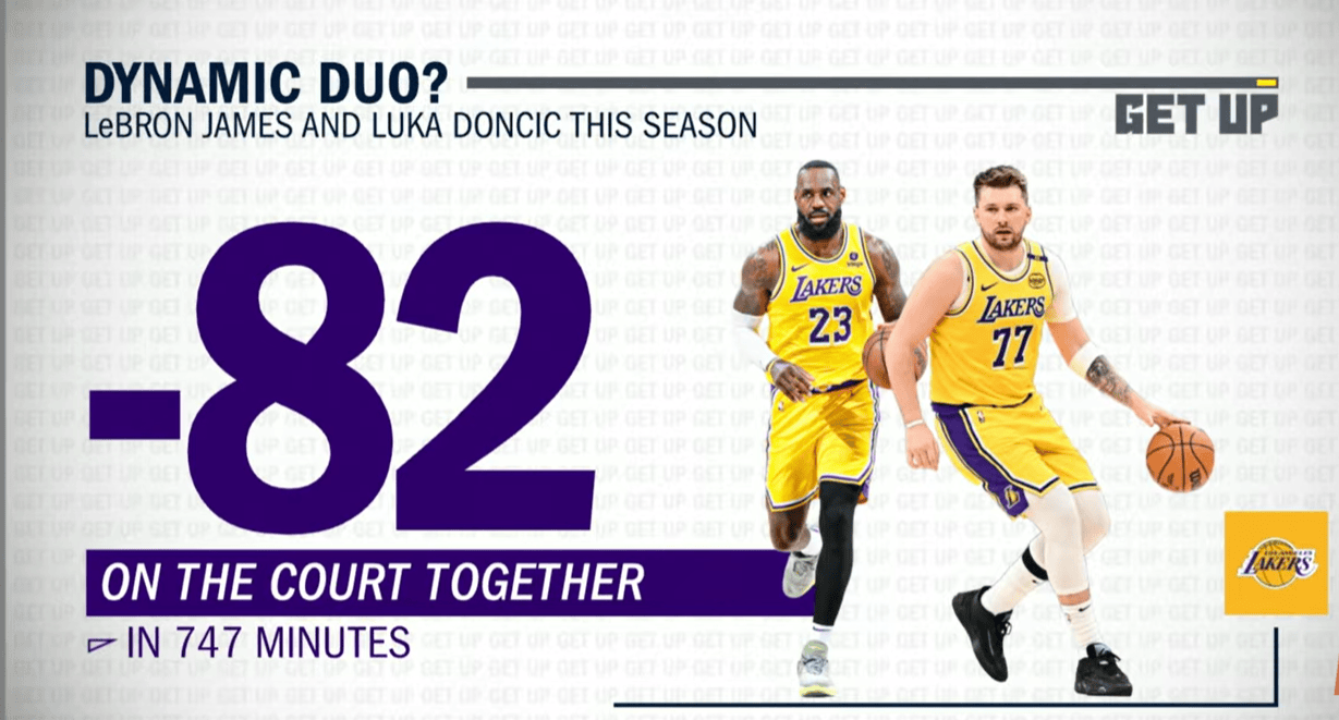 “勒布朗和东契奇的组合是一个窘态的搭配。本赛季两东说念主同期在场时正负值是-82,这是湖东说念主总共双东说念主组合中最差的。”