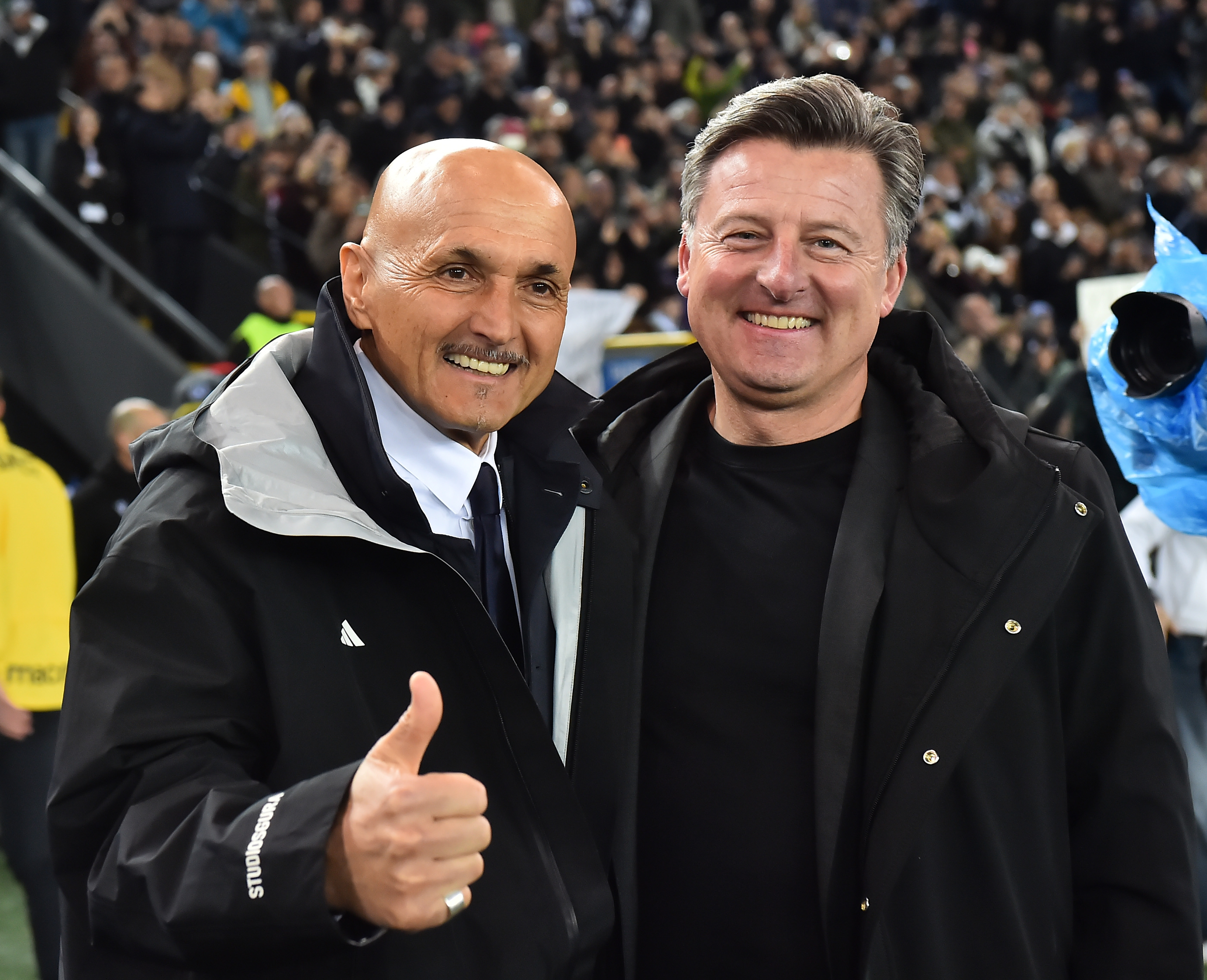 3月14日,尤文图斯队主造就斯帕莱蒂(左)与乌迪内斯队主造就鲁尼亚伊奇在赛前。新华社发(迭戈摄)