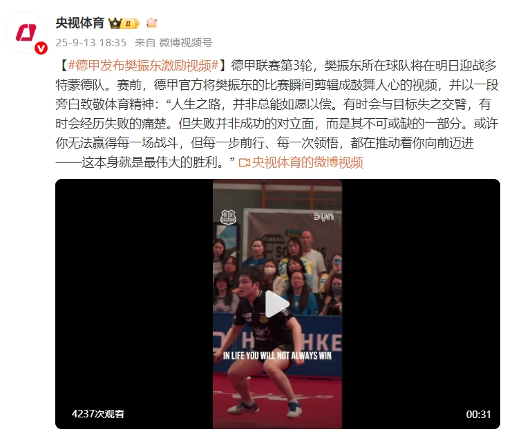 德甲联赛第3轮,樊振东地方球队将在明日迎战多特蒙德队。赛前,德甲官方将樊振东的比赛俄顷编订成饱读励东说念主心的视频,并以一段旁白请安体育精神:“东说念主生之路,并非总能称愿以偿。或然会与运筹帷幄交臂失之,或然会经验失败的。但失败并非得胜的对立面,而是其弗成或缺的一部分。大略你无法取得每一场讲和,但每一步前行、每一次和解,齐在鼓励着你上前迈进——这本人便是最伟大的告成。”