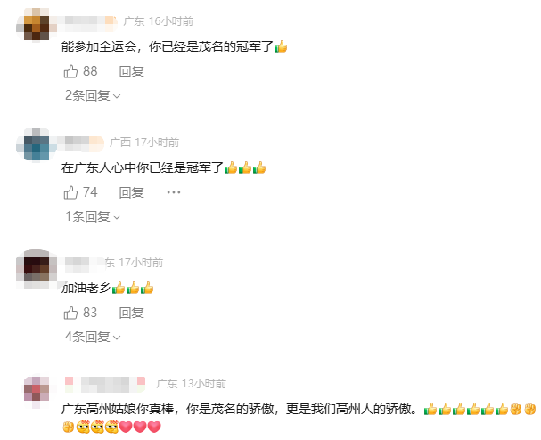 梁虹在赛场上的弘扬,也让家乡长者深感自豪。“茂名小姐好样的!”“这便是体育精神!”“这枚银牌金光闪闪!”……乡亲们纷纷为她点赞。