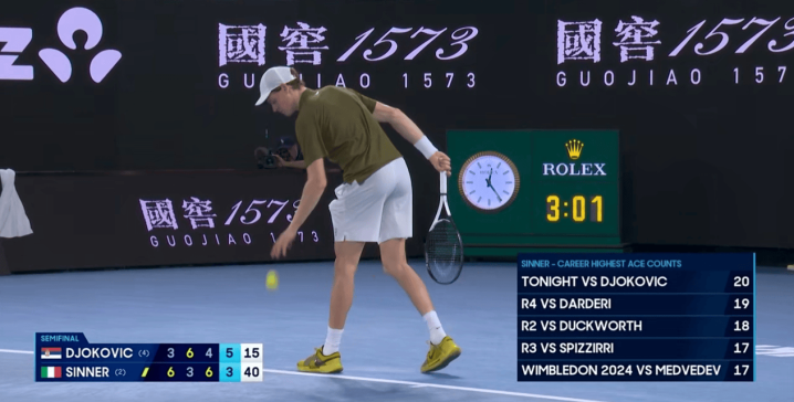 辛纳在第4盘第9局发出两个ACE球,整场比赛ACE球数来到21个,创造了个东谈主办事糊口单场大满贯ACE球数目。